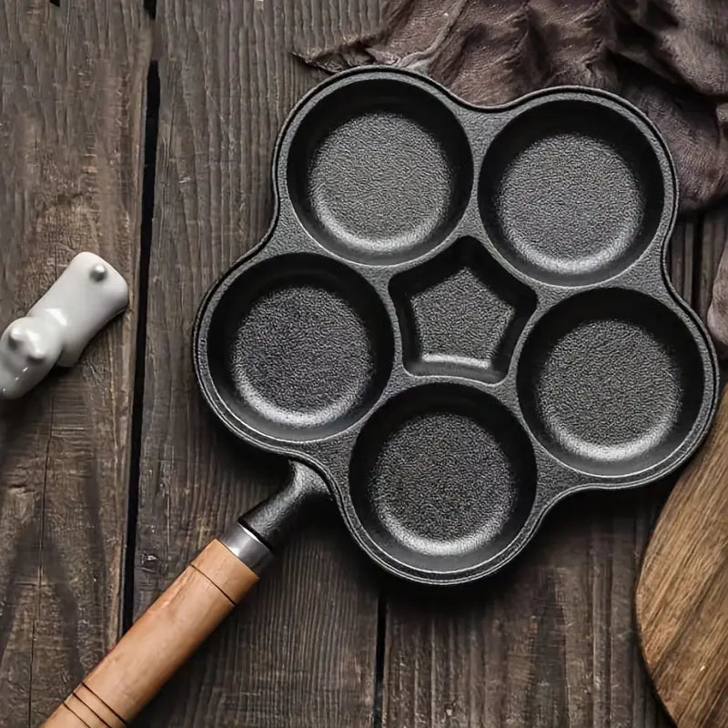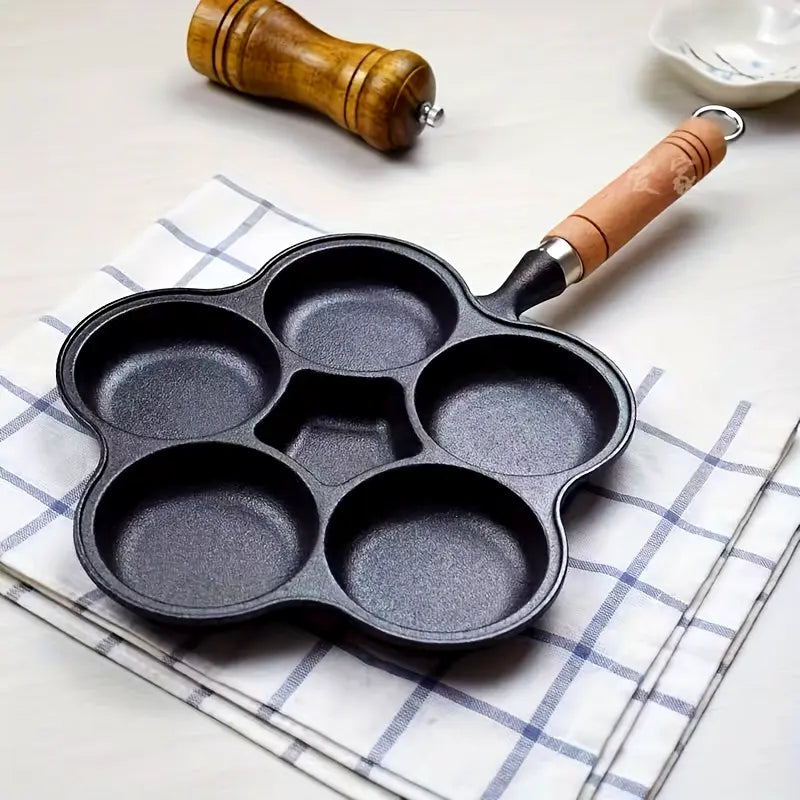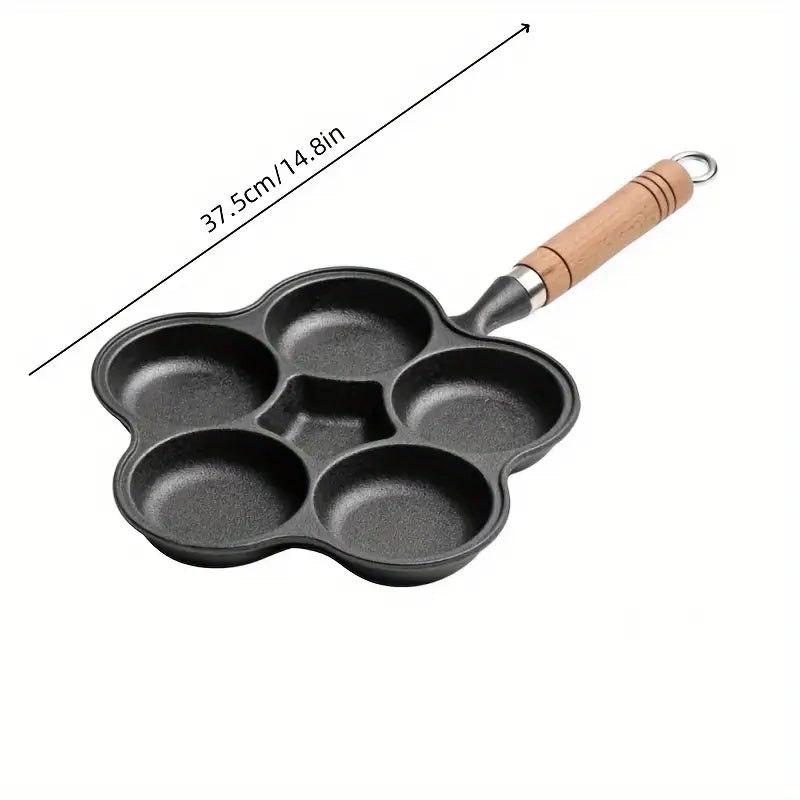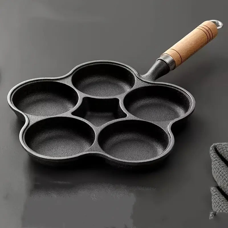 This 6-Hole Cast Iron Egg Pan is perfect for cooking multiple eggs, omelets, pancakes, and more at once. The nonstick surface ensures easy food release and cleaning, while the ergonomic wooden handle offers comfortable, safe handling. Ideal for use on gas, electric, ceramic, and induction stovetops.