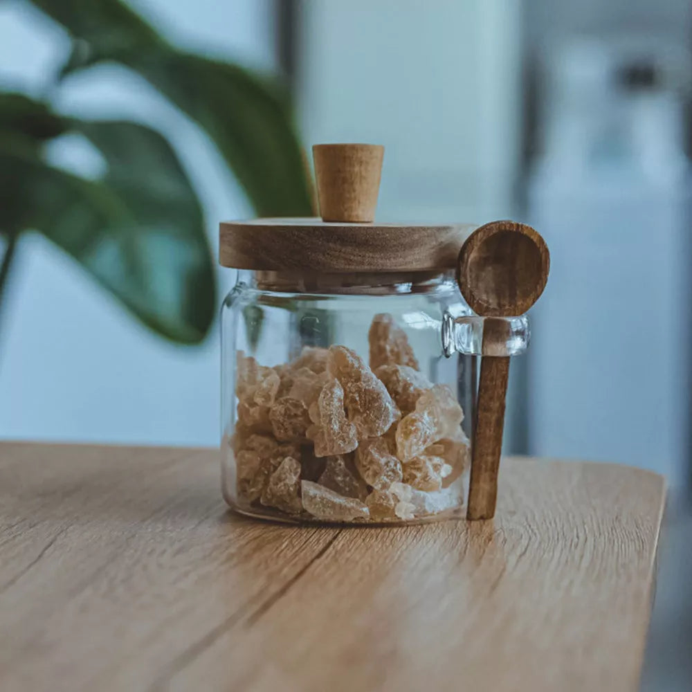 - Material: Glass (Jar), Wood (Lid & Spoon)