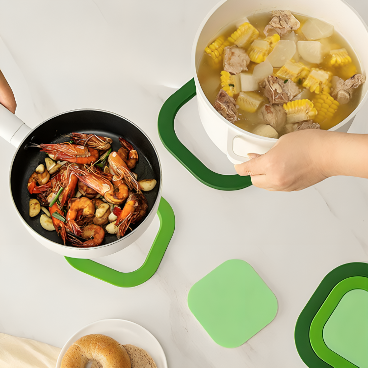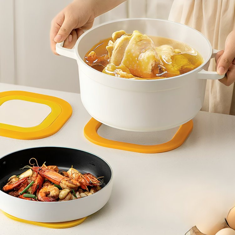 The mat features four built-in magnets that allow it to automatically adhere to composite magnetic-bottomed pots, ensuring a firm grip on the tabletop. This function prevents accidental slipping, keeping hot cookware securely in place while protecting surfaces from burns and scratches.