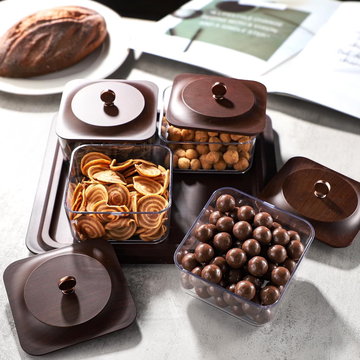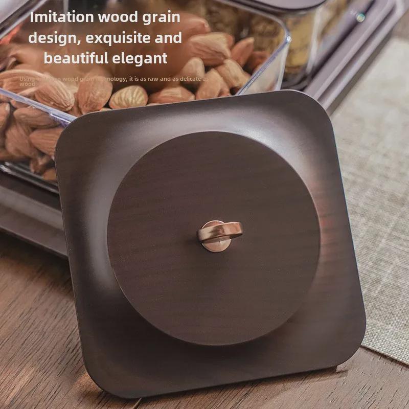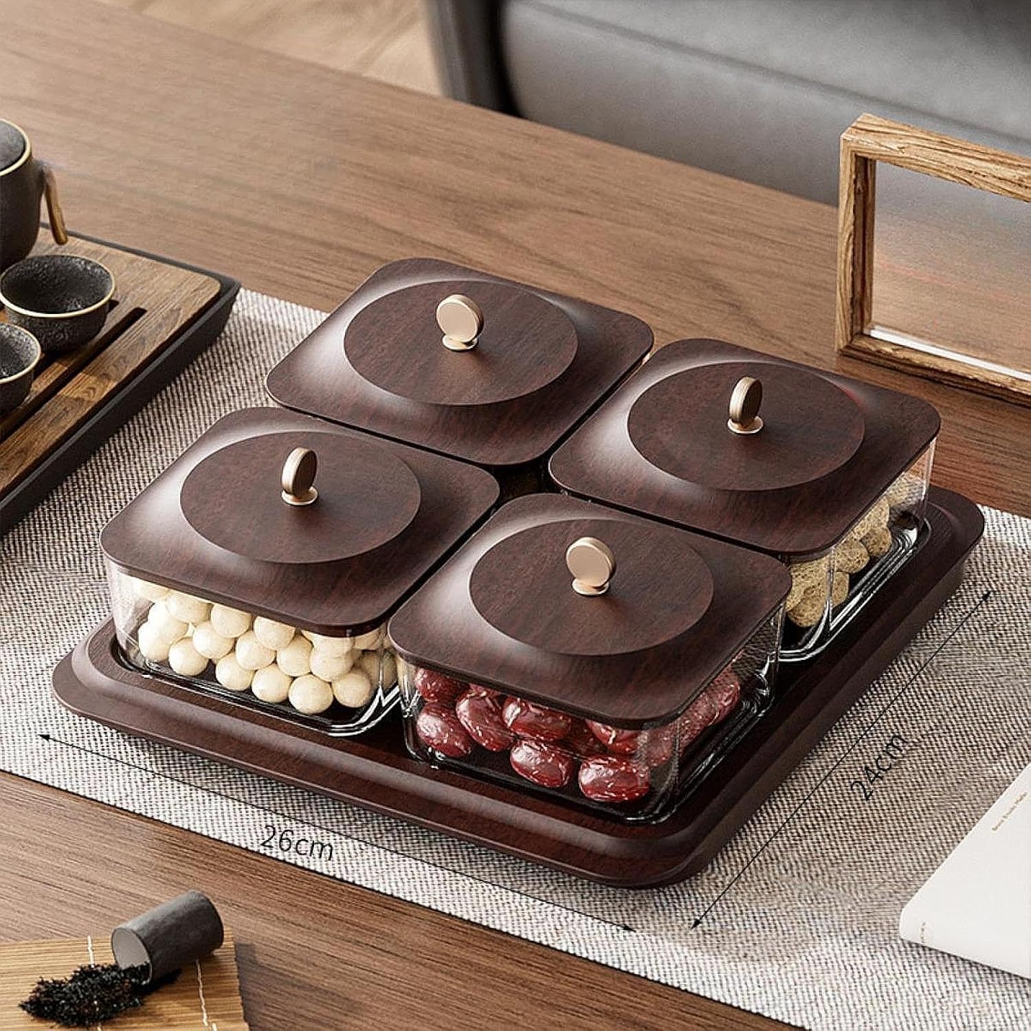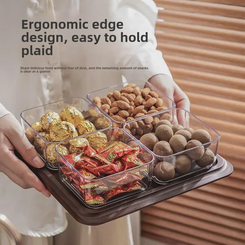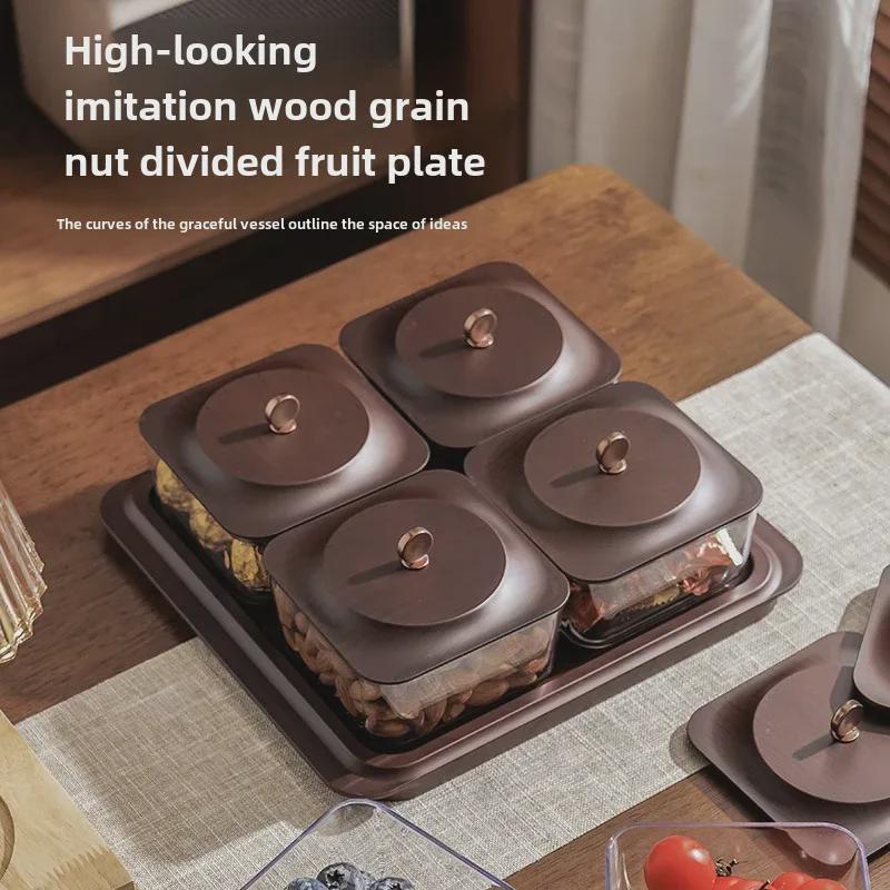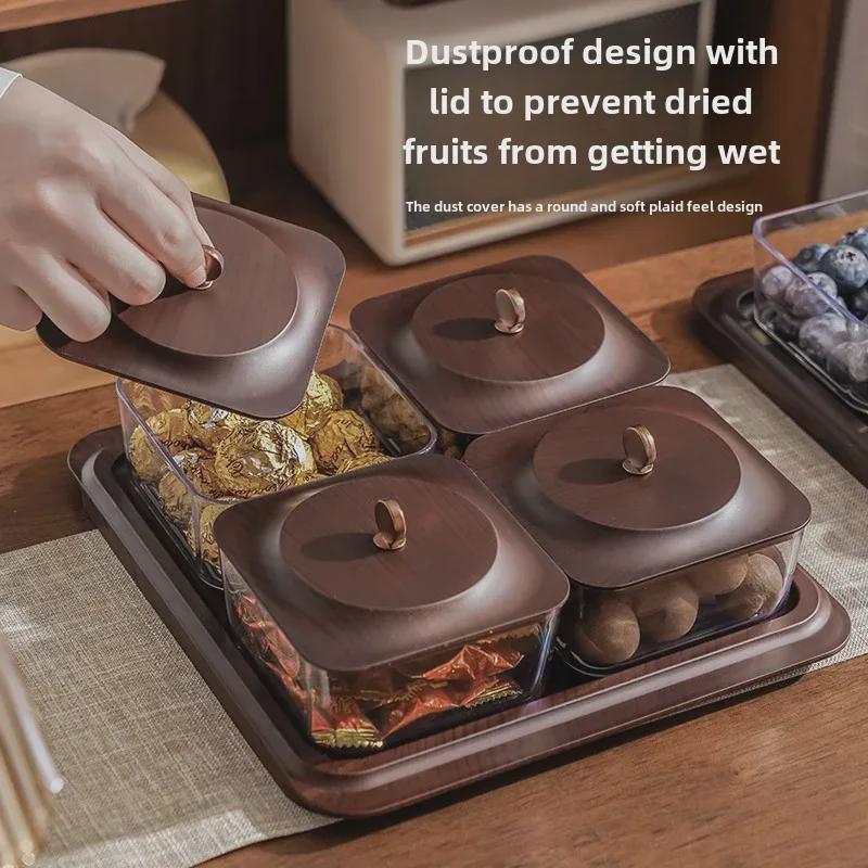Upgrade your home and kitchen storage with this elegant multi-compartment snack organizer. Featuring four divided sections and a dustproof lid, it’s perfect for serving dry fruits, candies, nuts, and condiments in a neat and stylish way. Crafted from durable PP and PET plastic with a wood-style finish, this 26cm tray blends vintage charm with modern functionality, making it ideal for both everyday use and festive gatherings.