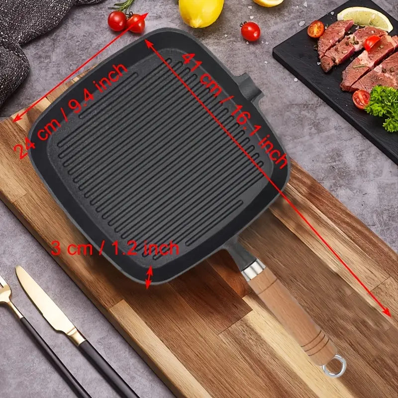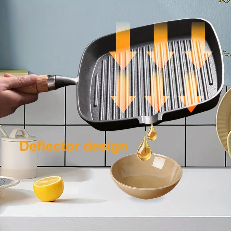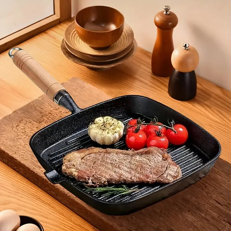 Elevate your cooking experience with the Cast Iron Grill Pan. This 22cm striped steak pan features a robust cast iron design and a comfortable wooden handle. Induction-friendly and heat-retentive, it ensures perfectly grilled steaks, vegetables, and more while being suitable for home use.